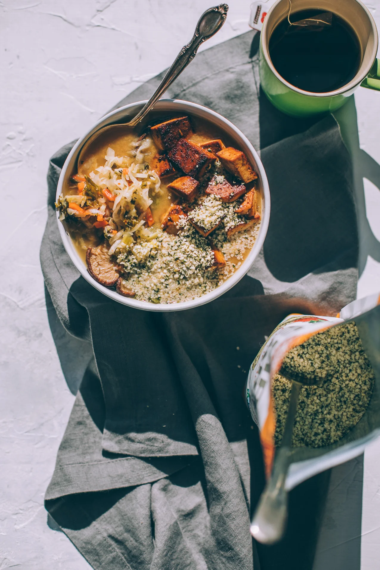 Lately my most typical lunch time fare is miso soup with millet ramen, bok choy, shiitakes, my functional mushroom broth and sautéed tamari tofu with a dash of rice vinegar. I add hemp hearts to that right before slurping it down (pictured below).