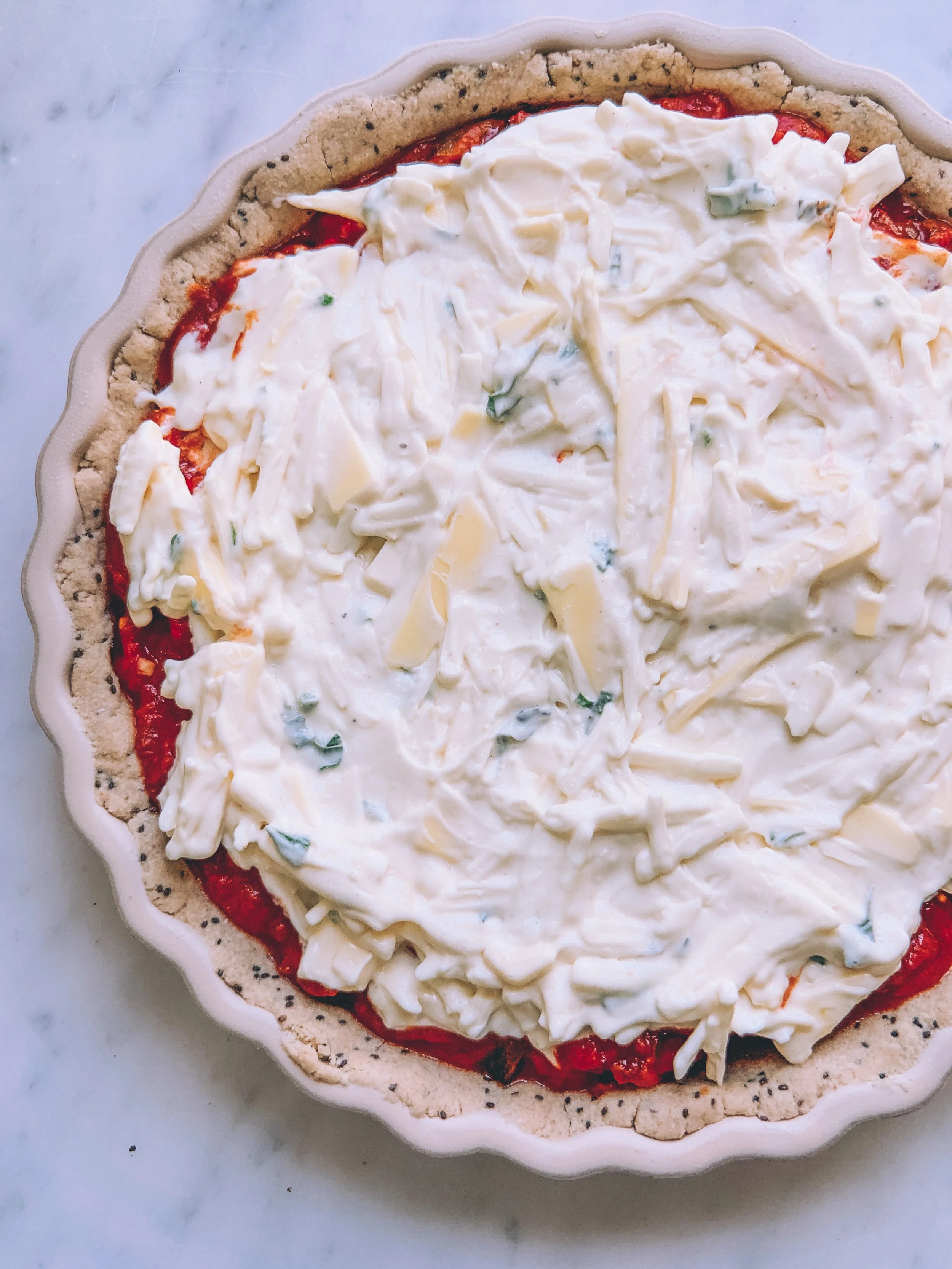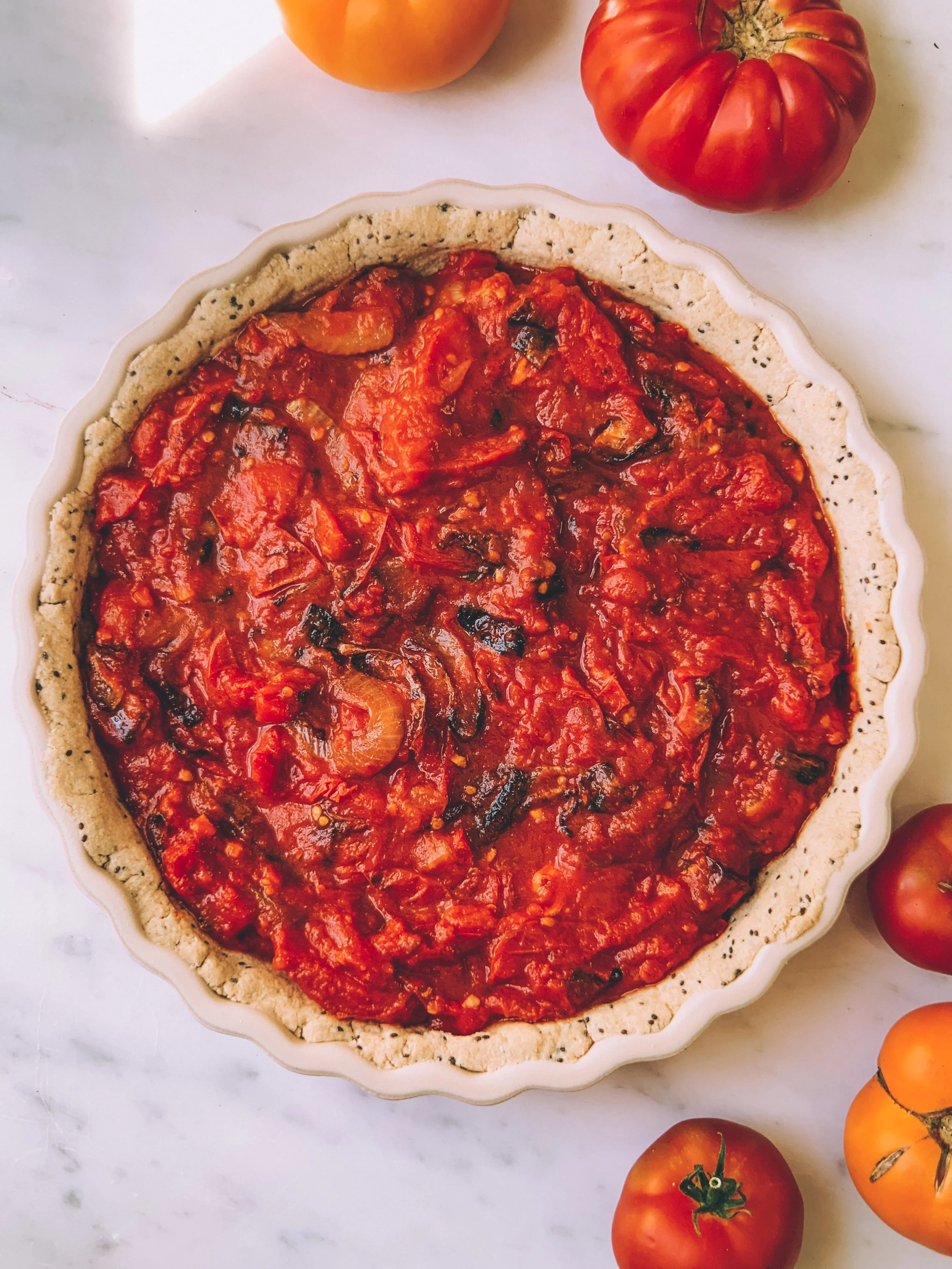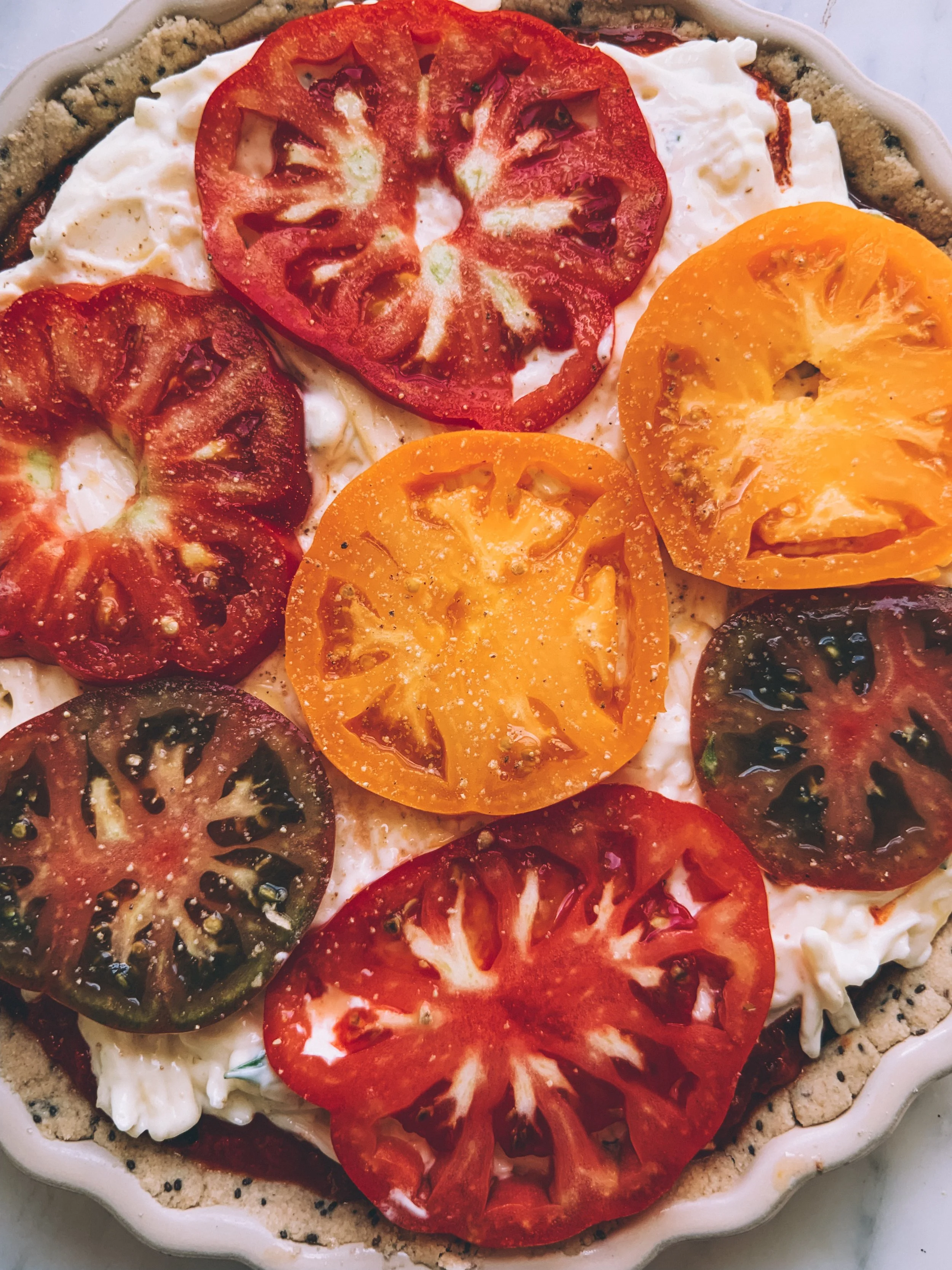 This recipe is adapted from a Southern Tomato Pie recipe I stumbled upon from Saveur Magazine. It looked so incredible I just had to try an adapted version for myself. The original is made with an all-butter wheat crust, Parmigiano and Fontina cheese. I’m opting for a dairy-free version, of course. Since that’s how we roll around here.