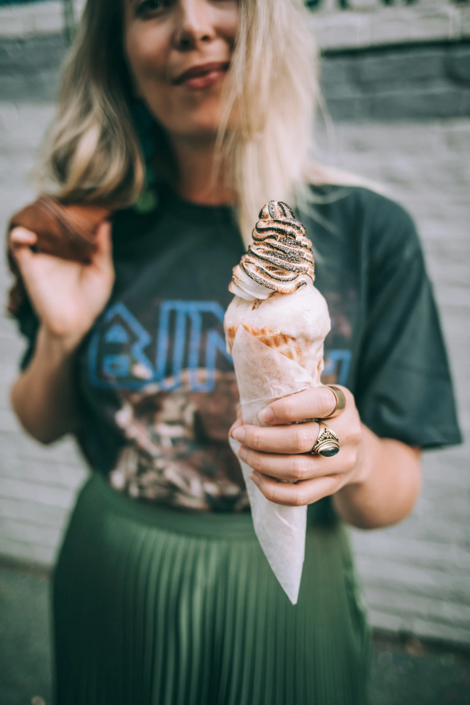 I love a good trip to the ice cream shop! A thick pleated olive satin skirt, vintage tee and terra-cotta jean jacket are just the right amount of chill for a low-key date-night or just hanging with the girls. I paired the outfit with a fiery, orange, slide-on suede heel. Toasted marshmallow fluff really rounds out the vibe, don’t you think?