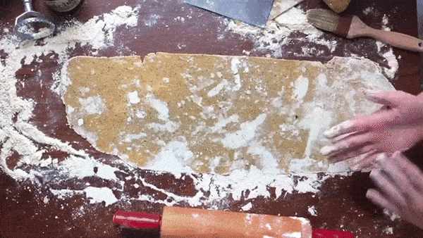 4. Flour a work surface lightly with chickpea flour and dust your rolling pin with flour as well. Using your rolling pin, roll dough into a long rectangle shape, about 3 millimeters thick and four inches wide. If edges rip or break simply press back together using your fingers -- a little bit of water helps to glue the pasta back together.
