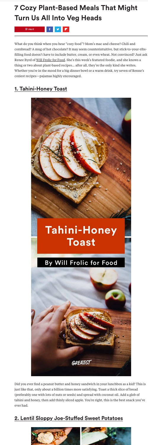 Academy of Culinary Nutrition: 1 | Bicycling.com: 1 | Buzzfeed: 1, 2, 3, 4, 5, 6 | Brit & Co.: 1, 2, 3, 4, 5 | Delish: 1 | The EveryGirl: 1 | FeedFeed: 1, 2, 3, 4, 5, 6, 7 | Food52: 1, 2 | Food Network (Canada): 1 | Greatist: 1, 2, 3 | Hello Natural: 1 | Huffington Post: 1 | The Kitchn: 1, 2 | Mozilla Firefox: 1 | Philly Mag: 1 | Self Magazine: 1, 2, 3 | Shape Magazine: 1 | Seventeen Magazine: 1 | Urban Outfitters Blog 1 | Wall St. Cheat Sheet: 1 | Williams Sonoma: 1 | Yahoo Food: 1